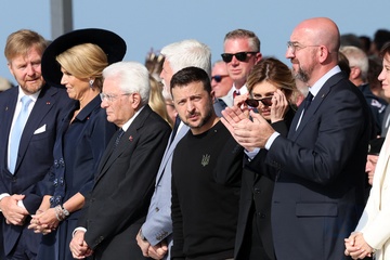 Prezydent Emmanuel Macron podczas międzynarodowej ceremonii na plaży Omaha w ramach obchodów 80. rocznicy lądowania w Normandii (D-Day) 52