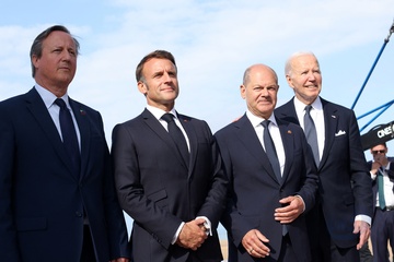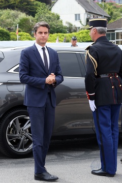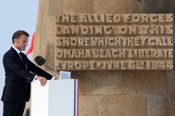 Le président Emmanuel Macron lors de la cérémonie internationale d'Omaha Beach dans le cadre de la commémoration du 80ème anniversaire du débarquement en Normandie (D-Day)