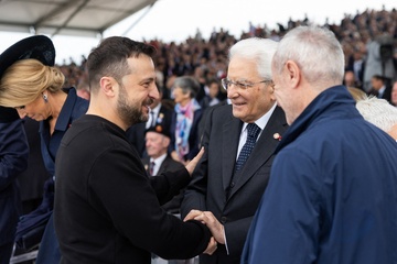 Le président de l'Ukraine lors de la cérémonie internationale d'Omaha Beach pour la commémoration du 80ème anniversaire du débarquement (D-Day) (Wolodymir Zelenski Sergio Mattarella prez Wloch)