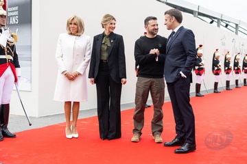 Le président de l'Ukraine lors de la cérémonie internationale d'Omaha Beach pour la commémoration du 80ème anniversaire du débarquement (D-Day) (Olena Zelenska Wolodymir Zelenski Prez Macron Brigitte Macron)