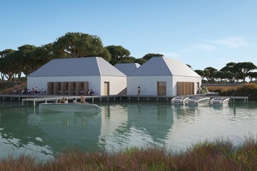 Kompleks turystyczny z domkami na palach pośrodku laguny w Portugalii