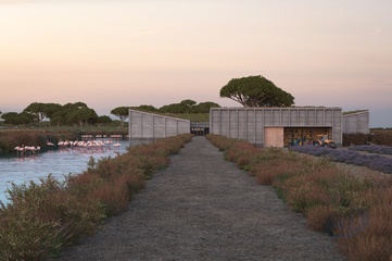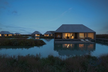 Un complexe touristique disposant de chalets sur pilotis au milieu d'un lagon au Portugal