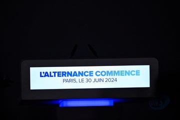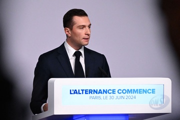Jordan Bardella, prononce un discours lors de la soirée de résultats du premier tour des élections législatives à Paris