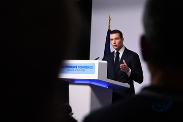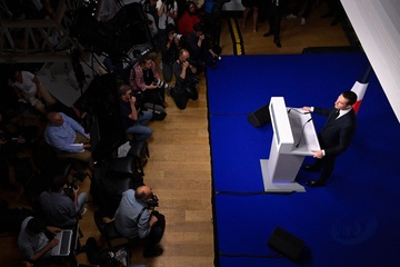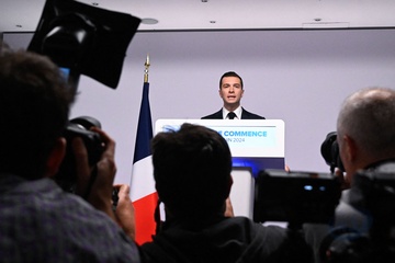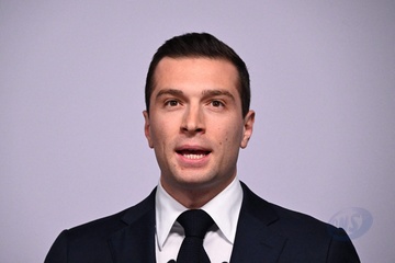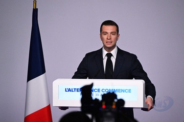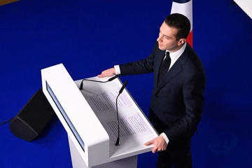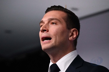 Jordan Bardella wygłasza przemówienie podczas wieczoru wyników pierwszej tury wyborów do organów legislacyjnych w Paryżu