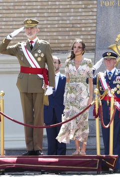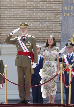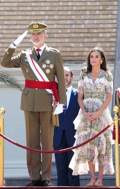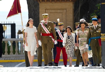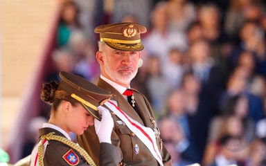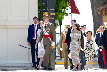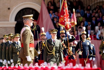 Le roi Felipe VI et la reine Letizia d’Espagne, et la princesse Leonor, lors de la cérémonie de remise des médailles à la nouvelle classe des sous-officiers de l'armée et de la Garde civile à Zaragoza