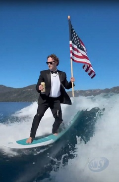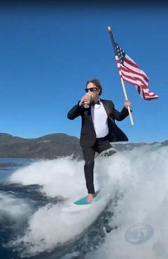 Mark Zuckerberg surfe en costume, une bière et un drapeau américain dans les mains Fesseà l’occasion des festivités du 4 juillet