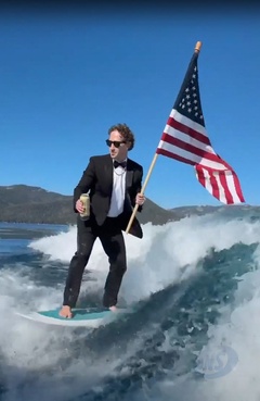 Mark Zuckerberg surfuje w garniturze, z piwem i amerykańską flagą w rękach Fesse podczas uroczystości 4 lipca