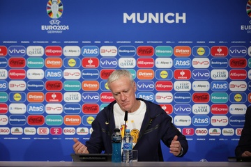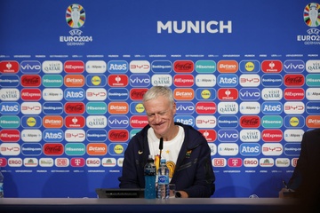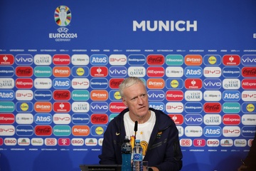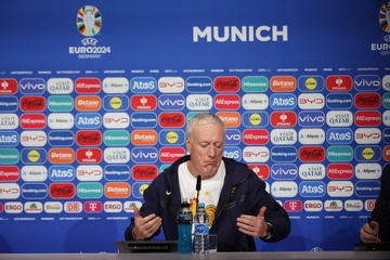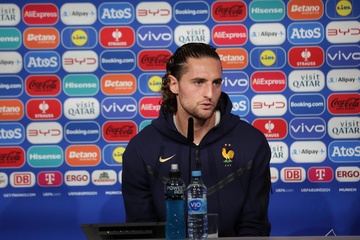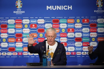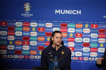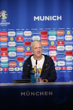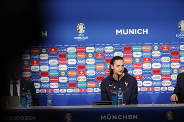 Didier Deschamps et Adrien Rabiot en conférence de presse lors du championnat d'Europe de football à Allianz Arena de Munich
