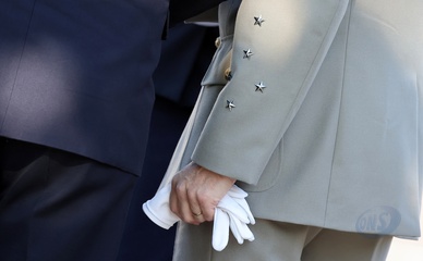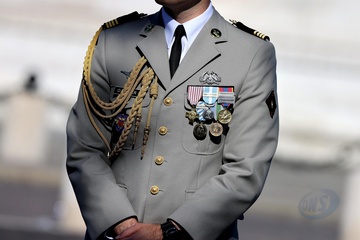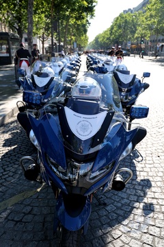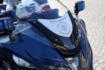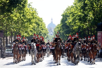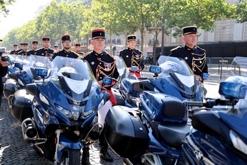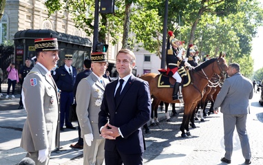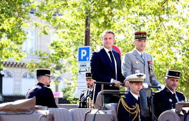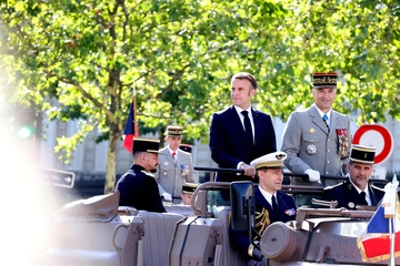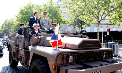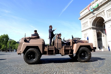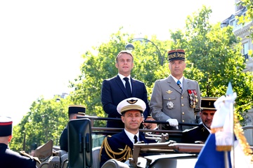 Prezydent Republiki Francuskiej Emmanuel Macron w towarzystwie generała Thierry’ego Burkharda, szefa sztabu sił zbrojnych, na pokładzie „samochodu dowodzenia” podczas ceremonii 144. defilady wojskowej 14 lipca, w Święto Narodowe, w Paryżu 36