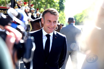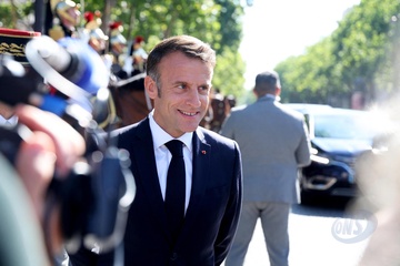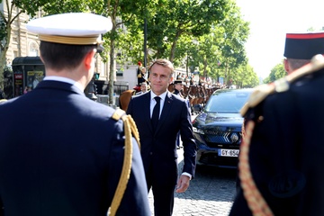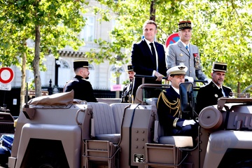 Le président de la République française Emmanuel Macron, accompagné du général Thierry Burkhard, chef d'état-major des armées à bord de la"command car" lors de la cérémonie du 144ème défilé militaire du 14 juillet, jour de la Fête Nationale, à Paris