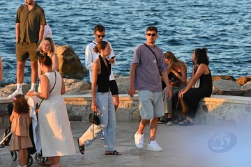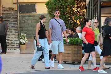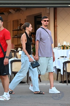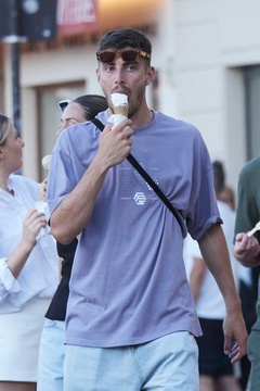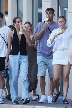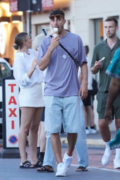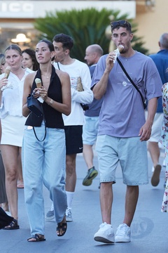 Exclusif - Kai Havertz et sa compagne Sofia Weber mangent une glace en se baladant avec des amis sur le port de Saint-Tropez