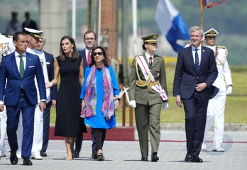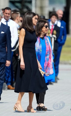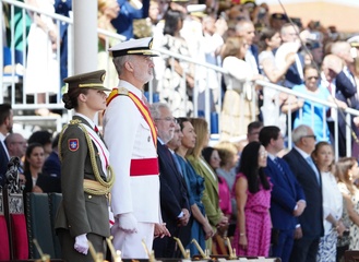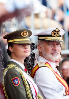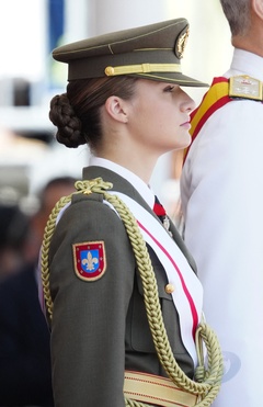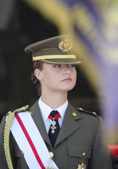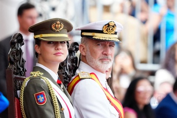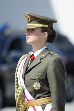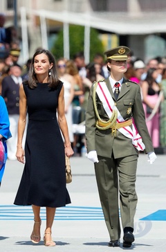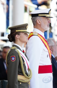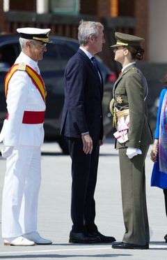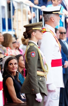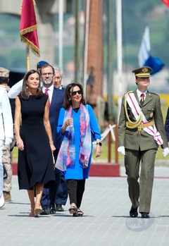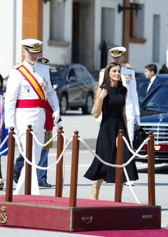 Król Felipe VI, królowa Hiszpanii Letycja i księżniczka Leonor podczas ceremonii przekazania zwolnień królewskich nowym oficerom Marynarki Wojennej w Marín 64