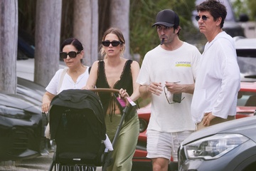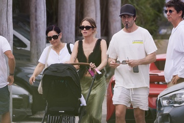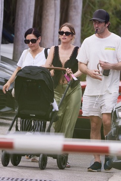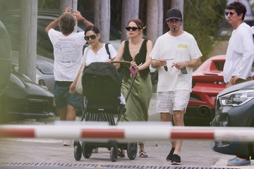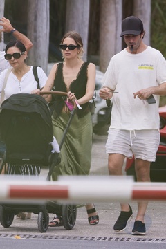 Exclusif - Ashley Benson et son mari Brandon Davis avec leur fille Aspen Davis (en pousstte) à la sortie du Club 55 à Saint-Tropez