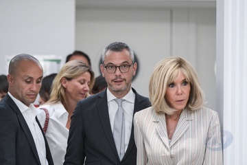Pool - Emmanuel Macron et sa femme Brigitte lors de l'inauguration de la Maison de l'Elysée, à l'occasion des Jeux Olympiques Paris 2024