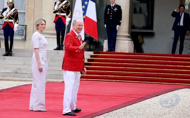 Charlene ksiezna Monako Emmanuel i Brigitte Macron witają w Pałacu Elizejskim głowy państw i rządów obecne na ceremonii otwarcia Igrzysk Olimpijskich w Paryżu w 2024 r. (OG) 202
