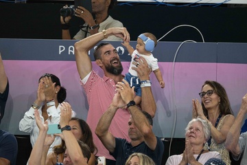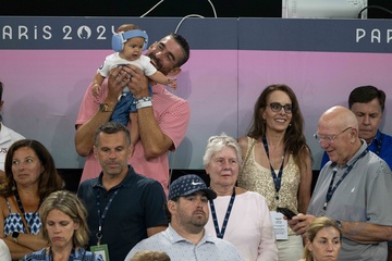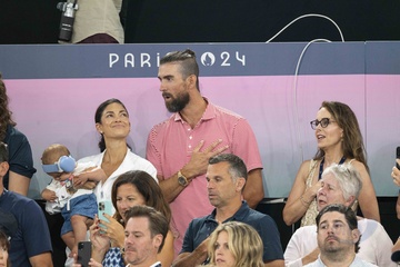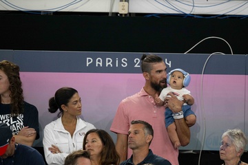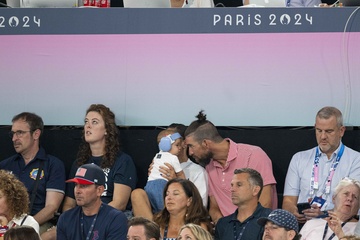 Michael Phelps et sa femme Nicole Johnson - Célébrités assistent aux épreuves de gymnastique lors des Jeux Olympiques de Paris 2024 (JO) au Palais omnisports Bercy Arena, à Paris