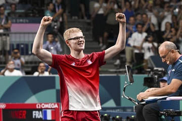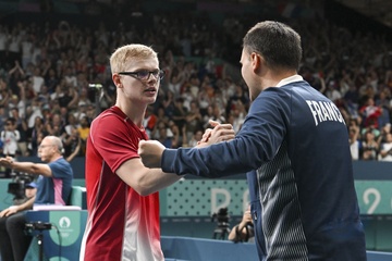 Félix Lebrun se qualifie pour les demi-finales aux épreuves de tennis de table lors des Jeux Olympiques de Paris 2024 (JO) à l'Arena Paris Sud