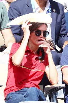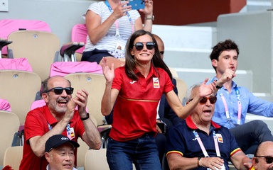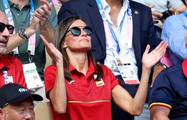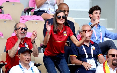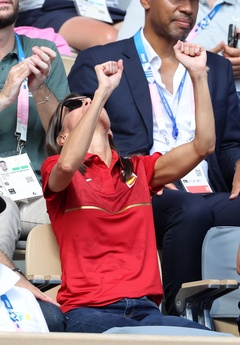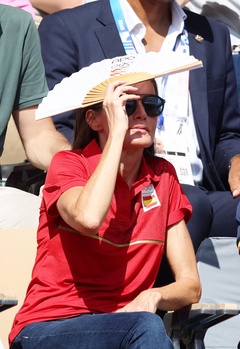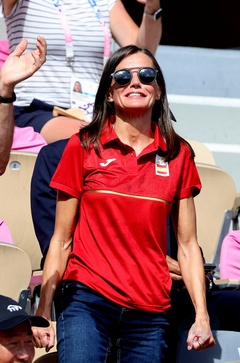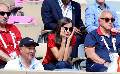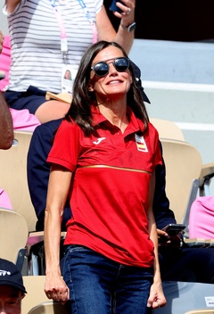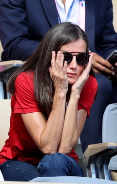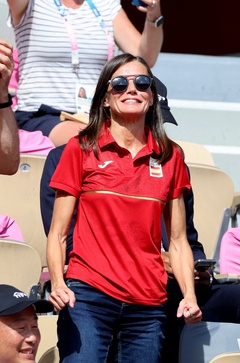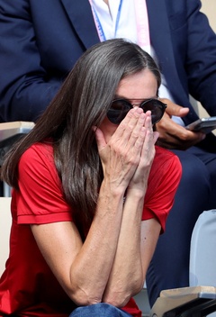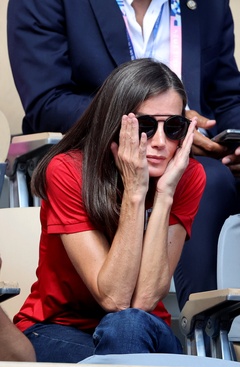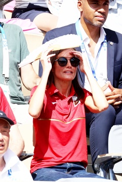 La reine Letizia d’Espagne assiste aux 1/4 de finale de tennis entre Carlos Alcaraz et Tommy Paul lors des Jeux Olympiques de Paris2024 (JO) à Roland Garros