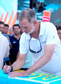 Król Hiszpanii Felipe VI podpisuje ukraińskie flagi dzieciom w Plama Yacht Club na Majorce przed Copa del Rey