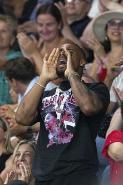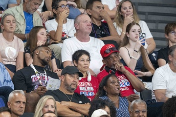 Simone Biles devant son compagnon Jonathan Owens et ses parents Nellie Biles et Ronald Biles lors des épreuves de Gymnastique artistique féminine, finale du concours général lors des Jeux Olympiques de Paris 2024 (JO)