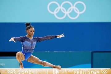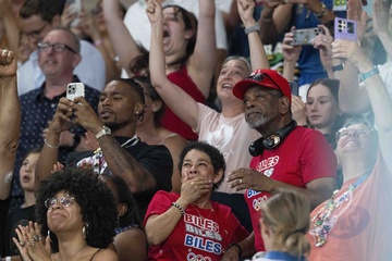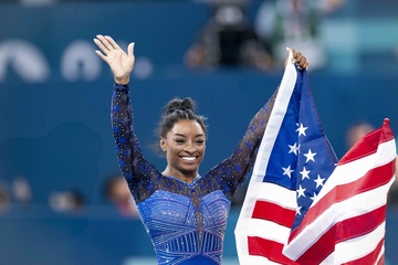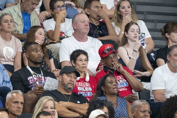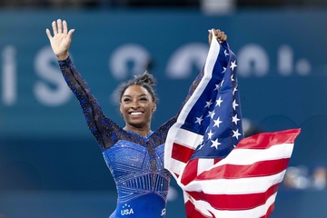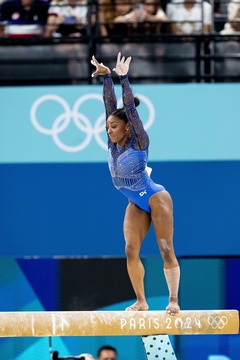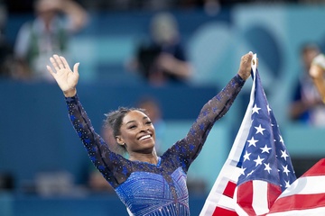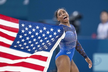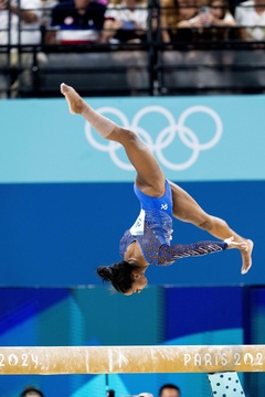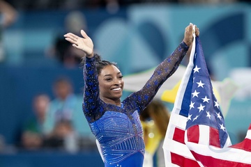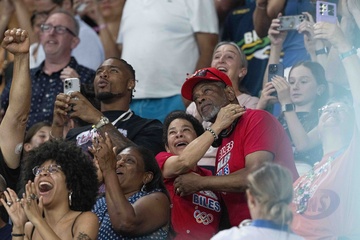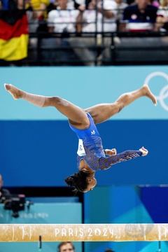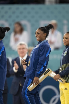 Simone Biles przed swoim towarzyszem Jonathanem Owensem oraz jej rodzicami Nellie Biles i Ronaldem Bilesem podczas zawodów gimnastyki artystycznej kobiet, wszechstronnego finału podczas Igrzysk Olimpijskich w Paryżu w 2024 r. 32