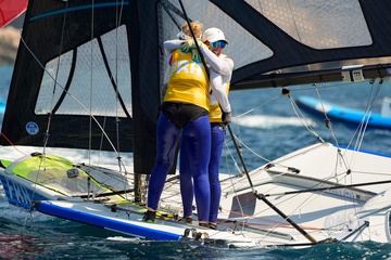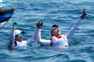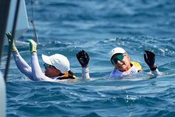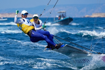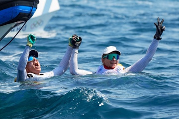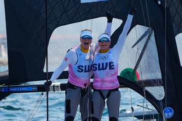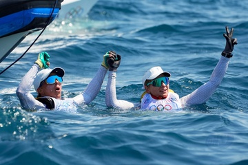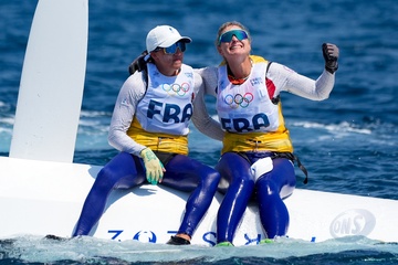 Sarah Steyaert et Charline Picon décrochent le bronze en épreuve de voile 49er FX lors des Jeux Olympiques de Paris 2024 (JO) à la marina de Marseille 21