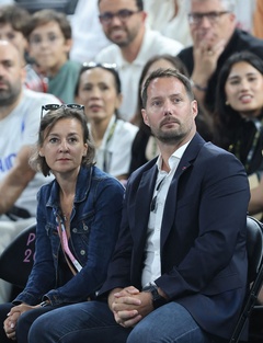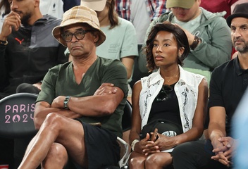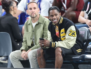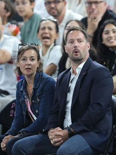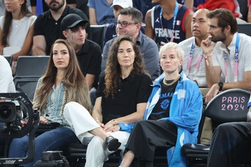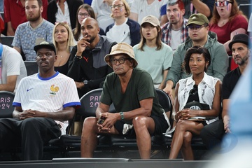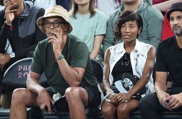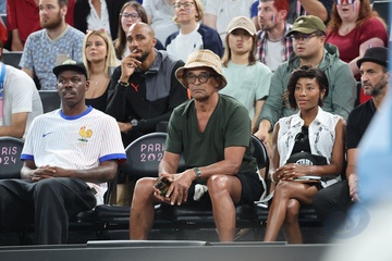 Gwiazdy na trybunach podczas półfinałowego turnieju koszykówki pomiędzy Francją a Niemcami podczas Igrzysk Olimpijskich w Paryżu w 2024 r. (OG) w Bercy Arena. 16