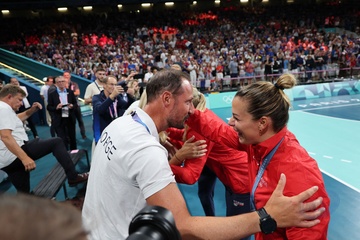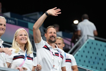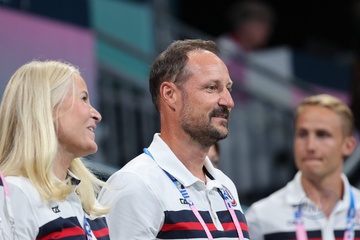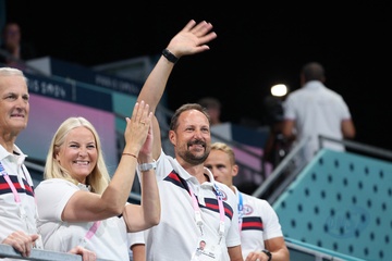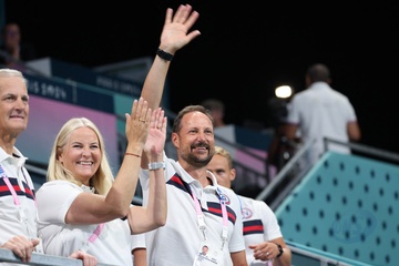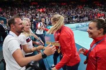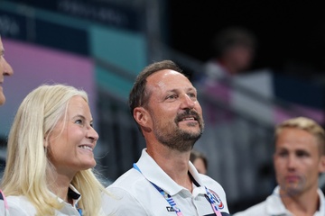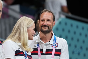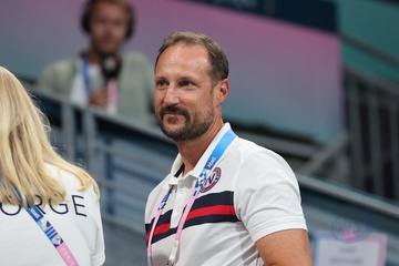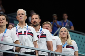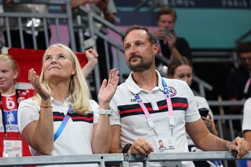 Książę Haakon i księżna Mette-Marit z Norwegii podczas finału piłki ręcznej kobiet pomiędzy Francją a Norwegią (21-29) podczas Igrzysk Olimpijskich Paryż 2024 27