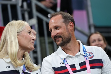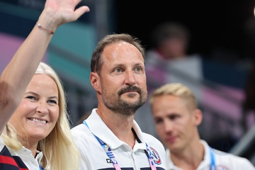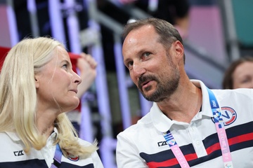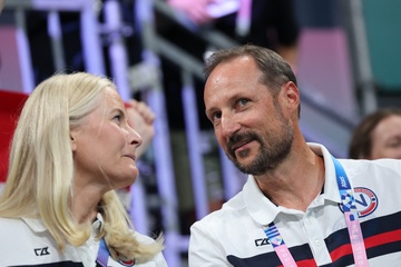 Le prince Haakon et la princesse Mette-Marit de Norvège lors de la finale de handball féminin entre la France et la Norvège (21-29) lors des Jeux Olympiques Paris 2024