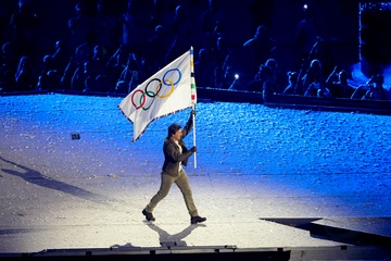 Tom Cruise wiszący na włosku schodzi z dachu Stade de France, aby odebrać flagę olimpijską