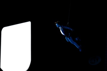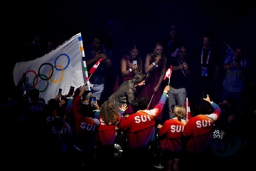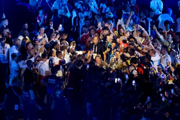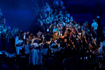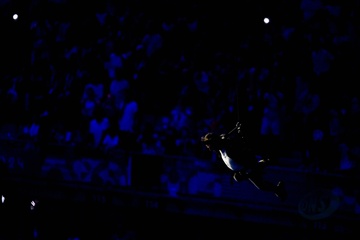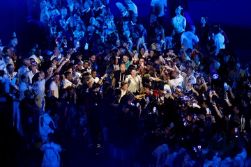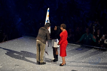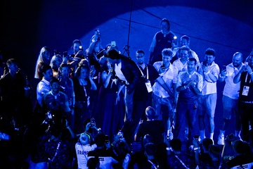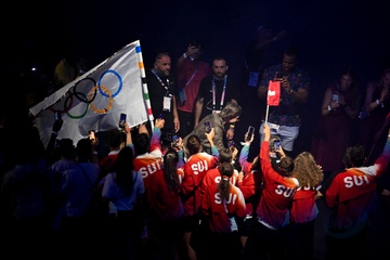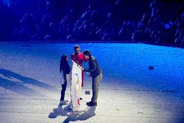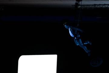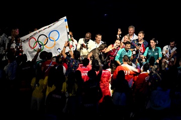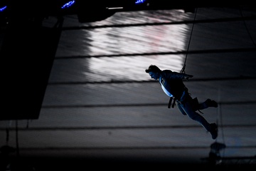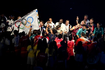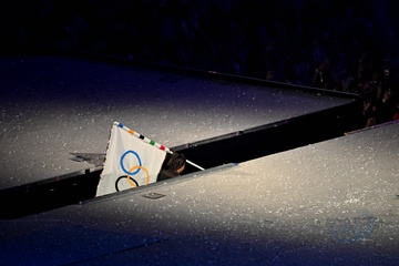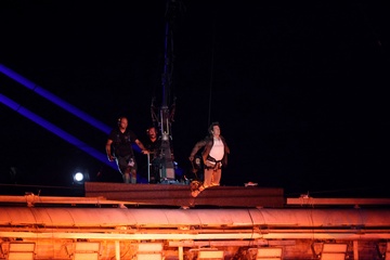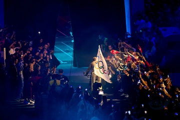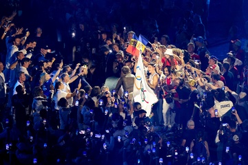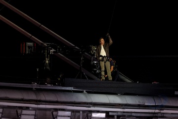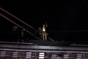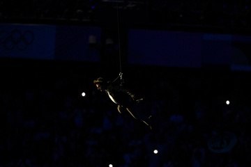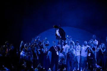 Tom Cruise, accroché à un fil, descend du toit du stade de France pour prendre le drapeau olympique