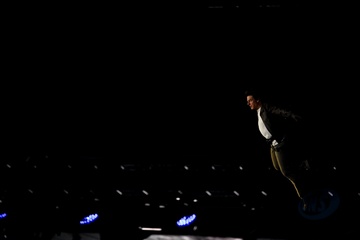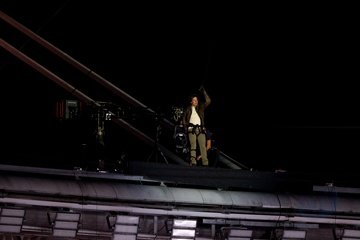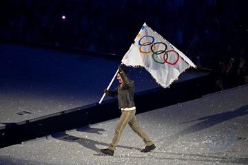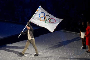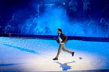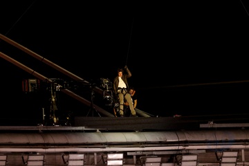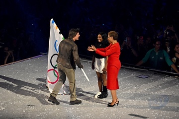 Tom Cruise wiszący na włosku schodzi z dachu Stade de France, aby odebrać flagę olimpijską