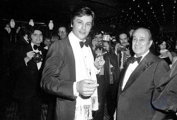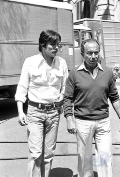 Alain Delon sur le tournage du film "Comme un Boomerang" réalisé par José Giovanni à Nice aux Studios de la Victorine avec des extérieus dans le quartier des Moulins, en mars 1976, ici au Palais de Justice avec Maitre Pasquini qui , en tant qu'avocat