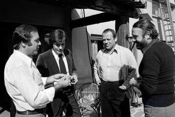 Jean Yanne, Alain Delon et Renato Salvatori sur le tournage du film Armaguedon réalisé par Alain Jessua, à Cagnes sur Mer en 1976