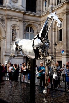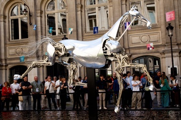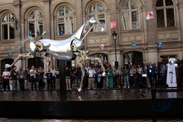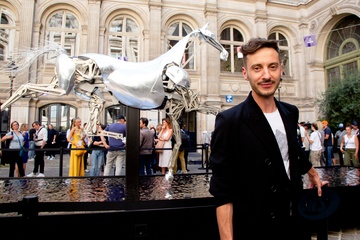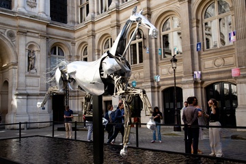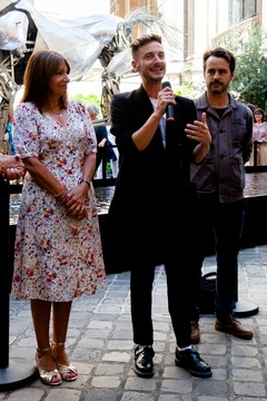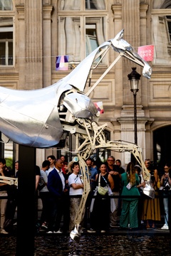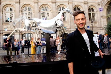 CB - Anne Hidalgo et Thomas Jolly lors de l'inauguration de l'exposition "Zeus / Ville de Paris", le cheval métallique de la cérémonie d'ouverture des Jeux Olympiques Paris 2024, à l'Hôtel de Ville de Paris