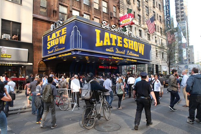 Bill Murray w brudnym kombinezonie przybyl do Show Lettermana, Nowy Jork