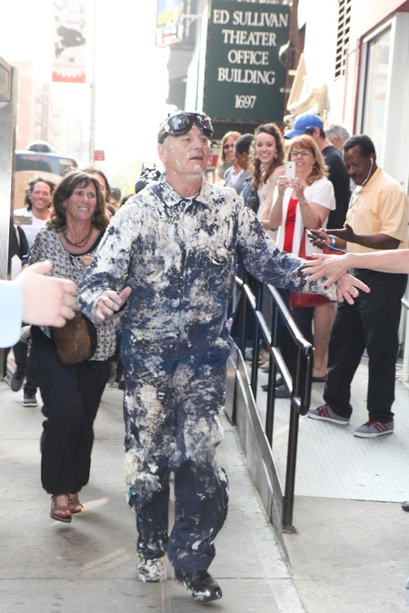 Bill Murray w brudnym kombinezonie przybyl do Show Lettermana, Nowy Jork