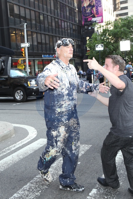 Bill Murray w brudnym kombinezonie przybyl do Show Lettermana, Nowy Jork