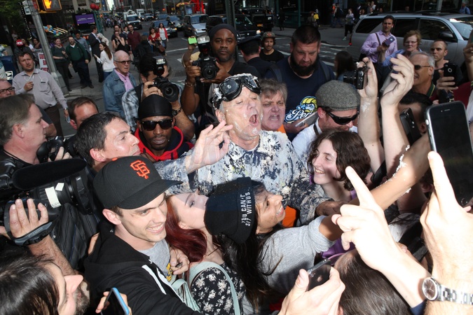 Bill Murray w brudnym kombinezonie przybyl do Show Lettermana, Nowy Jork