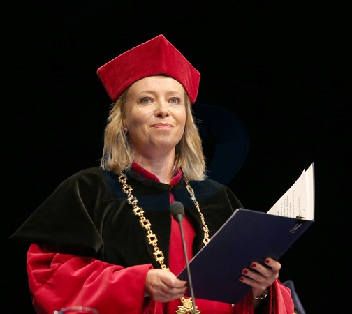 Rektor Dorota Segda w czarnym kolnierzu na znak popracia