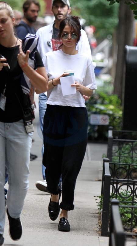 Selena Gomez w bialej koszulce i jeansach na planie filmowym