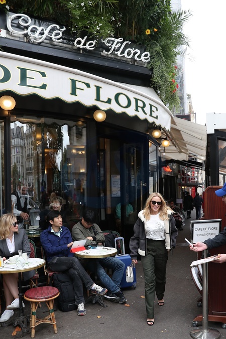 Kylie Minogue w kozuszku i z torebka z gwiazda idzie do kawiarni