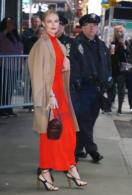 Kate Bosworth w czerwonej sukience i bezowym plaszczyku