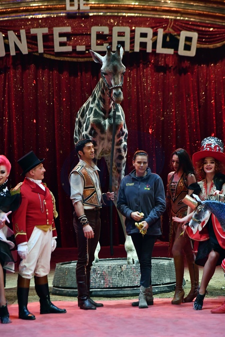 Ksiezniczka Stefania karmi zyrafe na 42. Monte-Carlo International Circus Festival