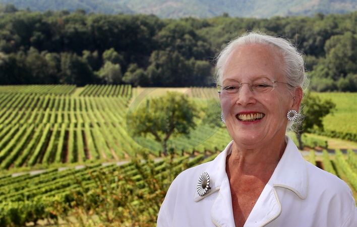 Krolowa Danii - Malgorzata II pozuje na tle winnic i swojego zamku Caix