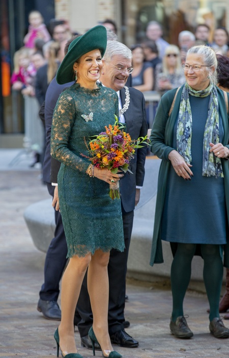 Krolowa Maxima w koronkowej, zielonej sukience i kapeluszu