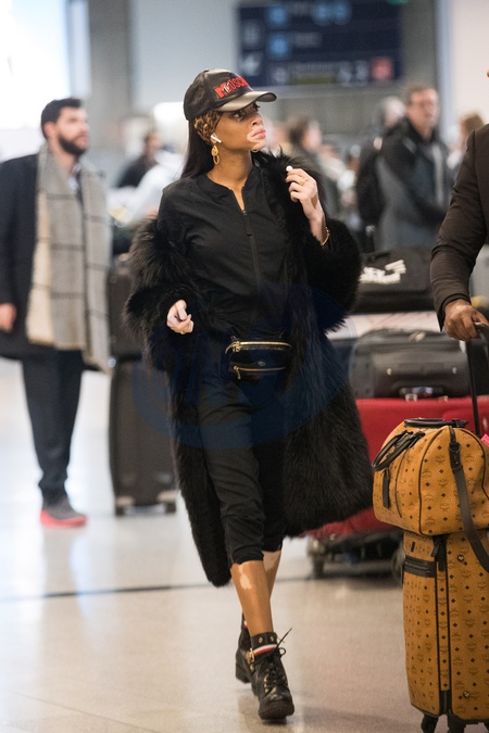 Winnie Harlow w czarnym futrze, maluje sie na lotnisku