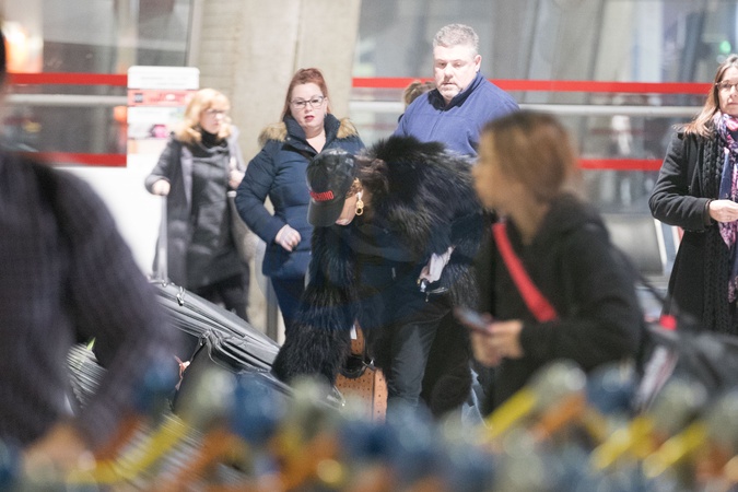 Winnie Harlow w czarnym futrze, maluje sie na lotnisku