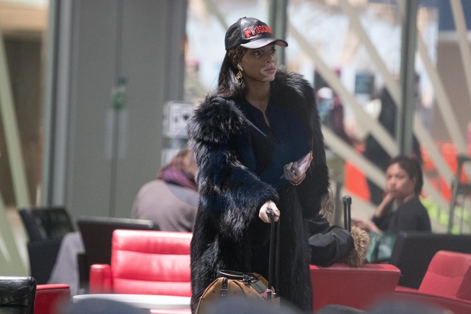 Winnie Harlow w czarnym futrze, maluje sie na lotnisku