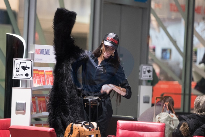 Winnie Harlow w czarnym futrze, maluje sie na lotnisku